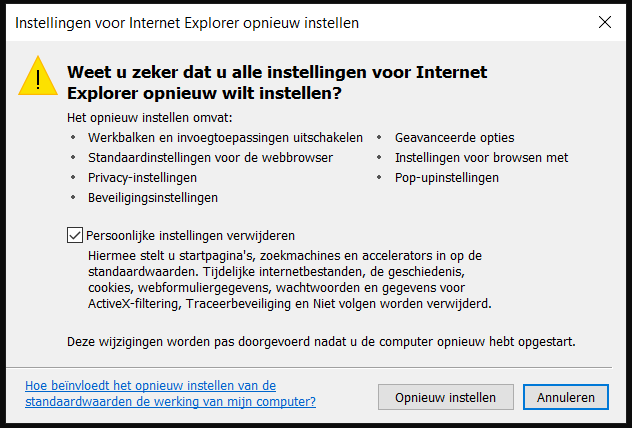 Er open zich dan dit venster. Vink aan dat je persoonlijke instellingen verwijderen wil en kies dan opnieuw instellen.