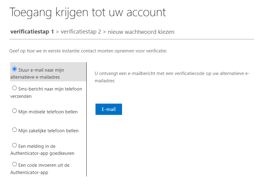 Om zelf een nieuw wachtwoord aan te maken krijg je zoals hier links afgebeeld eerst naar de door jouw ingestelde privé mail een code toegezonden, wie je daarna invult op de pagina.
